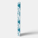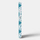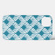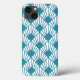 Ce boîtier téléphonique a un design art déco de diamants avec des lignes en diagonale qui ressemblent à des ventilateurs en turquoise sur un champ de blanc.