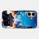 Une bande dessinée d'une voiture de sport circulant le long d'une route vers une ville. Couleurs vives, beaucoup d'action, design totalement amusant sur ce coque iphone.