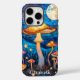 Cette étagère téléphonique captivante présente une scène forestière mystique centrée autour d'un grand champignon doré orangé, baptisé Deadly Webcap, dressé contre un ciel nocturne bleu profond, à motif ondulé, avec une lune bien visible et des étoiles étincelantes. Des champignons plus petits et brillants et une flore complexe émergent du sol bleu foncé, ce qui renforce l'atmosphère enchanteresse. Le design est personnalisé en bas avec le nom "Elizabeth".