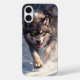 A majestic grey wolf with piercing yellow eyes stands on a thick tree trunk, its powerful paws gripping the bark. The wolf's fur is thick and textured, with a hint of brown around its muzzle. The background features a winter forest. Perfect gift for wolf lovers.