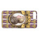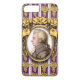 Les illustrations et la conception originales de ZoeSPEAK sur cette coque d'iPhone 8/7 Plus présentent un portrait du compositeur de musique classique Wolfgang Amadeus Mozart. Le portrait est un profil placé dans un cadre ovale doré orné. Le cadre est suspendu à un fond de papier peint violet avec des grappes de raisin dorées en rangées et des rayures blanches et lavande verticales.