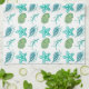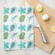 Montrée sur une serviette blanche, cette serviette de cuisine a des images de coquillages dans les tons bleu et vert. Customisez cet objet ou achetez comme indiqué.