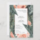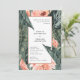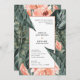 Faire-part de mariage de feuillage corail rose et feuille tropicale. Une partie d'une magnifique suite de mariage élégante. Collection tropicale moderne verte, bleue et corail.