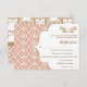 Elégante et belle carreaux marocains français inspiré cartes de réponse mariage avec un corail et or géométrique design motif et or hued fleuris. Cette carte RSVP haut de gamme et de luxe est parfaite pour une mariage à thème marocaine, arabe ou aladdin. Le dos de ces cartes personnalisées et fantaisistes peut être personnalisé avec les noms de la mariée et du marié sur le design imprimé ruban. Oeuvre et design © Chrissy H. Studios, LLC. Tous droits réservés.