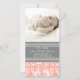 Nouveau bébé fille cartes photos sur mesure dans adorable et élégant peach rose orange, gris et blanc classique motif floral damask, entièrement personnalisable avec la photo et les détails de naissance de votre bébé, une excellente façon de partager l'heureuse nouvelle de la naissance de votre fille avec des amis et la famille.