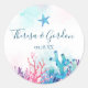 Coral Starfish, Sticker Mariage Plage. Animée et audacieuse, cette invitation à la douche nuptiale est idéale pour les mariages à la plage, les mariages à destination ou à la plage. Créé avec du corail rose, violet et bleu aux accents simples de coquillages. Customisez ce dessin avec votre date de mariage et les noms de mariée et de mariée.