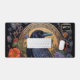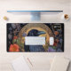 Tapis de bureau avec un corbeau noir. Une arche jaune derrière. Entouré de fleurs rouges et violettes. L'ambiance gothique cool.