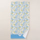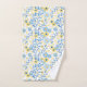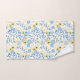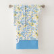 Cette serviette de bain de trois pièces présente un joli motif floral moderne et chic, qui est principalement bleu, jaune et blanc de fleurs de maïs. Au fond de la grande serviette de bain se trouve une bordure bleue assortie à votre monogramme sur un cercle blanc. Assurez-vous de voir les produits de décoration maison assortis, y compris un rideau de douche, dans notre magasin.