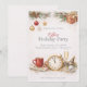 Corporate holiday design featuring an ivory textured background with red and gold accents, pine garland, ornaments, and wrapped box detail. Includes champagne flute, clock, and festive desk elements. Clean layout suited for hosting a polished office celebration in a professional setting.