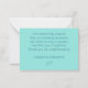 Pas d'enfants sur les cartes du boîtier mariage. Customisez un court message sur les cartes bleu-vert turquoise. Le texte imprimé est gris avec une ombre bleue et un petit coeur est imprimé en bas. L'exemple de message est : "Nous demandons respectueusement que notre réception de mariage ne soit composée que d'invités de plus de dix-huit ans. Merci pour la compréhension." Changez le libellé pour inclure la cérémonie, ou "jour de mariage", ou tout ce dont vous avez besoin. Modifiez la taille de la carte tant que votre texte correspond à l'espace et est bien éloigné des bords de la carte. L'inverse est un bleu cyan clair solide comme l'avant.