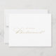 Cette élégante carte de proposition de femme de chambre en or est parfaite pour un mariage rustique. Le design sobre et élégant présente une typographie de script classique et sophistiquée en or. Changez le libellé et utilisez ces cartes pour demander à tous les membres de votre fête de mariage : bonne d'honneur, maîtresse d'honneur, demoiselle d'honneur, demoiselle d'honneur, demoiselle d'honneur junior, fille de fleurs, meilleur homme, groomsmen et plus !