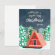 Illustration d'un cabine rétro vintage à cadre A dans les bois et citation, "Wishing you a super cosy Christmas" avec lettrage original.