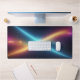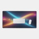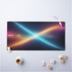 Completely transform your daily workspace or intense gaming setup into a modern command center with this breathtaking abstract cosmic desk mat. This massive horizontal canvas flawlessly showcases a spectacular collision of energy in deep space. Dynamic, glowing diagonal beams of bright cyan and warm golden-orange intersect perfectly in the center, creating a brilliant starburst against a deep, starry night sky.