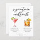 Cette feuille de menu de cocktails sophistiquée vous propose une simple typographie noire au-dessus de 2 de vos boissons préférées et de leurs ingrédients pour votre bar mariage côtier. Un dessin cosmopolite chic et Dark & Stormy ajoute une touche amusante à votre menu de bar. Complétez avec les noms du couple et la date de leur réception.