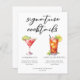 Cette feuille de menu de cocktails sophistiquée vous propose une simple typographie noire au-dessus de 2 de vos boissons préférées et de leurs ingrédients pour votre bar mariage côtier. Un dessin chic cosmopolite et Long Island Iced Tea ajoutent une touche amusante à votre menu du bar. Complétez avec les noms du couple et la date de leur réception.