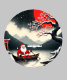 Ce t-shirt minimaliste représente un paysage hivernal japonais serein avec des touches fantaisistes comme Père Noël dans un bateau et un bonhomme de neige sur la lune, rendu en rouge, noir et blanc.