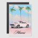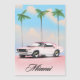 Affiche de voyage Miami Pink Sunset présentant une voiture musculaire rétro américaine contre un coucher de soleil en soirée.