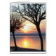 Un coucher de soleil romantique au bord du lac, dans lequel celui-ci se reflète le soleil orange entre deux arbres noirs.