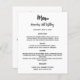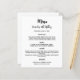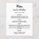 Arrière - plan transparent. Texte noir. Avant : Personnalisez et ajoutez votre nom, votre date et le menu. Retour : Programme. Si vous avez un grand programme, vous pouvez réduire l'espacement des lignes. Arrière - plan transparent pour que vous puissiez ajouter la couleur de votre thème de partie dans l'outil de conception. 1 feuille = 1 menu imprimé bord à bord.