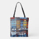 Scène de peinture stylisée colorée du port de Nyhavn à Copenhague par l'artiste populaire Lisa Lorenz maintenant Disponible sur un élégant Sac fourre-tout All-Over-Print.