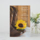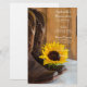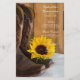 Laissez les invités de votre ferme rurale ou de votre ranch thème doux quinze festivités événement savent ce qu'ils vont manger avec le charmant Country Sunflower Western Quinceañera Party Menu. Personnalisez-le avec la salade ou le premier plat, l'entrée ou le deuxième plat et le dessert ou le troisième plat. Ce menu rustique chic et sucré 15, décontracté mais classe, présente une photo florale d'une fleur de tournesol jaune, des bottes de cowboy en cuir marron et du bois de grange patiné. Idéal inspeco pour votre cowgirl ou vaquera.