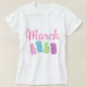 T-shirt couleur faire-part de maternité avec Dû En mars slogan faire-part de grossesse. Le slogan "March Baby" aux couleurs pastel vous permet de partager vos nouvelles passionnantes avec vos amis et votre famille.