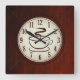 Beau arrière - plan en bois marron avec des chiffres et tasse de café vapeur sur un cercle central. Entièrement personnalisable, ajouter/supprimer des éléments ou personnaliser cette horloge carré avec du texte.