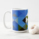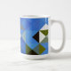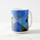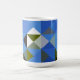 Oeuvre d'art numérique d'origine composée d'une forme géométrique de carrés et de triangles de couleurs complémentaires à la couleur principale du bleu. La motif est contemporaine et ressemble à des blocs de courtepointe. Ce sont des tasses de 15 onces, juste la taille parfaite pour votre café ou thé maison brassé - ou mieux encore chocolat chaud! Il ferait un grand cadeau et vous pouvez mettre des paquets de café ou de sacs de thé à l'intérieur - ou un petit plante - pour le rendre spécial pour votre être cher.