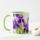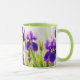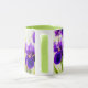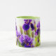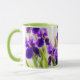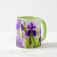 Cette jolie tasse florale présente ma photo originale de fleurs Iris violettes dans un jardin, traitée avec une technique d'aquarelle pour un style illustré, peint avec une touche de fantaisie. Il a une couleur verte à l'intérieur et sur la poignée, qui peut être changée si désiré. Ce sont des tasses de 11 onces, juste la taille idéale pour votre café ou thé maison - ou même du chocolat chaud! Il ferait un grand cadeau et vous pouvez mettre des paquets de café, des sachets de thé ou du chocolat chaud à l'intérieur. Une autre idée de cadeau est de mettre un petit plante dedans pour le rendre spécial pour votre être cher.