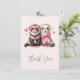 Carte de remerciements avec une jolie illustration. Une paire de loutres en vêtements rose. Portant des chemises rayées, l'une portant une cravate et l'autre portant un arc. Entouré de coeurs d'amour.