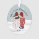 Célébrez votre premier Noël avec cette amusante illustration d'un couple blonde et brune caucasien avec des cheveux ondulés sur l'épaule et le dos à vous en portant des pulls moches de Noël ; Chapeaux de Père Noël et boire du chocolat chaud. Ils sont assis dans un paysage enneigé à travers lequel la neige douce et les flocons de neige tombent. Les mots, notre premier Noël suivi de l'année, apparaissent sur le devant et le dos a un modèle photo pour vous de customiser.
