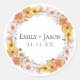 Cet autocollant rond est orné d’une belle couronne florale peinte à la main, encerclant les noms du couple et la date de l’événement dans une police élégante et moderne. La couronne est composée de fleurs douces d'aquarelle dans les tons pêche, jaune et roux, accentuées par la verdure délicate, créant un design romantique et d'inspiration nature. Les noms du couple sont affichés en évidence au centre, avec la date de l’événement cachée en dessous, ce qui en fait une touche de finition parfaite pour les faveurs de mariage, les invitations ou les sacs de bienvenue. Le motif floral intemporel ajoute une touche de sophistication, tandis que les détails personnalisés font de chaque autocollant un souvenir significatif pour les clients.