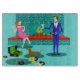 Ce Couple Rétro avec Dog Cutting Board ressemble à une scène d'une comédie romantique. Le style des années 1960, design minimaliste, dispose d'un couple séduisant qui profite d'une soirée romantique à la maison. La salle sophistiquée est dotée d'un aqua et d'une cheminée en brique turquoise avec une corniche rouge vif. Une belle femme rousse portant une robe rose et brillante est perchée sur la corniche. Elle savoure un martini avec une olive flottante, un feu rugissant, une bonne musique, et la compagnie un homme grand, sombre et beau. L'homme porte un costume bleu et une cravate rouge. Son martini verre est élevé pour trinquer son charmant compagnon. D'autre part, il tient un album vinyle. A ses pieds, on voit un dachshund des plus adorables portant un collier rouge. Le chien éveillé se déplace dans la direction d'un joueur de disque vert avec des pattes oranges et broches. Au sol, il y a un groupe coloré de disques vinyles amusants, éclectiques. Santé! Voici la soirée parfaite à la maison.
