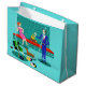 Ce sac cadeau Retro Couple with Dog ressemble à une scène d'une comédie romantique. Le style des années 1960, design minimaliste, dispose d'un couple séduisant qui profite d'une soirée romantique à la maison. La salle sophistiquée est dotée d'un aqua et d'une cheminée en brique turquoise avec une corniche rouge vif. Une belle femme rousse portant une robe rose et brillante est perchée sur la corniche. Elle savoure un martini avec une olive flottante, un feu rugissant, une bonne musique, et la compagnie un homme grand, sombre et beau. L'homme porte un costume bleu et une cravate rouge. Son martini verre est élevé pour trinquer son charmant compagnon. D'autre part, il tient un album vinyle. A ses pieds, on voit un dachshund des plus adorables portant un collier rouge. Le chien éveillé se déplace dans la direction d'un joueur de disque vert avec des pattes oranges et broches. Au sol, il y a un groupe coloré de disques vinyles amusants, éclectiques. Santé! Voici la soirée parfaite à la maison.