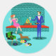 Ces Stickers Retro Couple with Dog Stickers ressemblent à une scène d'une comédie romantique. Le style des années 1960, design minimaliste, dispose d'un couple séduisant qui profite d'une soirée romantique à la maison. La salle sophistiquée est dotée d'un aqua et d'une cheminée en brique turquoise avec une corniche rouge vif. Une belle femme rousse portant une robe rose et brillante est perchée sur la corniche. Elle savoure un martini avec une olive flottante, un feu rugissant, une bonne musique, et la compagnie un homme grand, sombre et beau. L'homme porte un costume bleu et une cravate rouge. Son martini verre est élevé pour trinquer son charmant compagnon. D'autre part, il tient un album vinyle. A ses pieds, on voit un dachshund des plus adorables portant un collier rouge. Le chien éveillé se déplace dans la direction d'un joueur de disque vert avec des pattes oranges et broches. Au sol, il y a un groupe coloré de disques vinyles amusants, éclectiques. Santé! Voici la soirée parfaite à la maison.