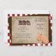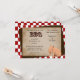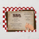 Grande invitation pour les couples ayant un barbecue après le mariage. L'invitation a un arrière - plan à damiers rouge et blanc et une représentation graphique d'un cochon.