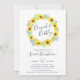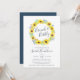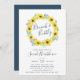 Les invitations pour brunch avec douche nuptiale Country chic comprennent une couronne de tournesols aquarelle, de feuilles verts et de minuscules bourgeons bleus marine, encerclant "brunch & bubbly" en lettres manuscrites chic. Personnalisez avec vos détails de brunch de douche nuptiale sous.