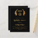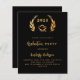 Arrière - plan noir. Une couronne de laurier classique et une casquette de graduation. Personnalisez et ajoutez l'année, le nom et les détails. Texte doré. 1 feuille = 1 invitation imprimé bord à bord.