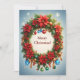 Couronne de Noël lumineuse et joyeuse ornée de poinsettias vibrants, d'ornements scintillants, de flocons de neige et de rubans sur un fond chaud et doux symbolisant la joie et les célébrations des fêtes.