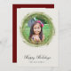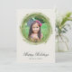 Couronne de pin de forêt d'hiver aquarelle, "Joyeuses Fêtes", carte de photo de vacances à plat sur fond de crème antique. Au dos de la carte, une deuxième photo encadrée sur fond rouge profond avec des lignes de modèle pour votre texte personnalisé.