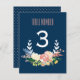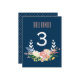 Une fraîche et moderne couronne florale illustrée entoure le numéro de table sur cette carte de table florale rose et marine colorée.