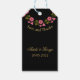 Une étiquette cadeau de mariage floral magnifiquement riche et moody avec des couronnes florales d'aquarelle rose sur l'arrière - plan noir. Cet élégant design associe des appareillages serif et des polices de caractères de script décorés de fleurs roses d'aquarelle. Personnalisez l'exemple de texte affiché dans le modèle de design avec les noms de la mariée et du marié, la date du mariage ou tout autre texte souhaité.