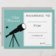 Un prix universitaire de classe décerné avec une image de thème de la science télescope pour encourager un jeune étudiant en sciences ou en astronomie. Vous pouvez écrire dans vos propres détails. Une excellente ressource pour n'importe quel type de professeur de classe.