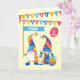 Une carte d'anniversaire amusante pour un cousin que vous pouvez customiser avec son âge. La couverture frontale a deux mignons gnomes, l'un tenant une bannière qui dit, 'COUSIN' et l'autre tient un ballon rouge où vous pouvez ajouter l'âge de votre cousin. Les gnomes sont basés sur la "tomte" du folklore scandinave, le mâle avec une longue barbe blanche et la femelle avec d'épaisses tresses blondes, ou tresses. Ils ont tous deux de très grands casquettes qui couvrent leurs yeux ; ils ont de gros nez et ils portent chacun une boîte cadeau ainsi que la bannière et le ballon. 'Joyeux anniversaire' est épelé en lettres blanches sur le bottillon coloré en haut et la couleur arrière - plan est un jaune très pâle et brillant. Le message intérieur n'est qu'une suggestion et vous pouvez facilement le modifier ou le supprimer si vous le souhaitez.