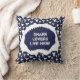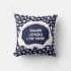 coussin cool imprimé partout avec un motif bleu marine et blanc de rangées de dents de requin, avec la mâchoire ouverte du requin sur le dessus. Dans la bouche ouverte est une zone de texte personnalisable pour que vous puissiez ajouter vos propres noms ou votre message. Idéal pour les surfeurs ou plongeurs.