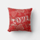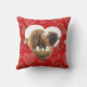 Typographie d'amour rouge et blanc accent coussin avec un mignon motif de coeur doodle et une photo de couple de forme de coeur personnalisée avec les initiales des noms. Créez votre propre cadeau personnalisé pour un couple !