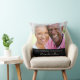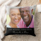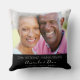 Un oreiller en cadeau, célébrant 25 ans de mariage. Un fond noir moderne élégant. Personnalisez et ajoutez votre propre photo de haute qualité du couple heureux. Le texte : les noms sont écrits avec une écriture manuscrite moderne blanche. Modèles pour les noms et une date.