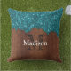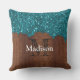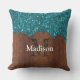 Aqua blue scintille bois rustique Monogram Coussin extérieur. Personnalisez votre coussin coussin brillant avec votre nom et votre initiale. Le bleu d'Aqua brille le bois brun rustique cassé. Elégant faux brillant bleu aqua scintille avec un morceau de bois brun rustique cassé. *photo de parties scintillant pétillante !