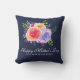 Un coussin avec un joli bouquet de roses aquarelles avec des sprigs, des feuilles et des branches, le tout dans un agencement fleuri coloré. Arrière - plan bleu marine. Le texte dit : Bonne fête des mères. Meilleure maman au monde.