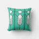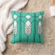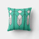 Cet oreiller de lancer a un design de vitrail art déco de diamants et de lignes en blanc, noir et turquoise.